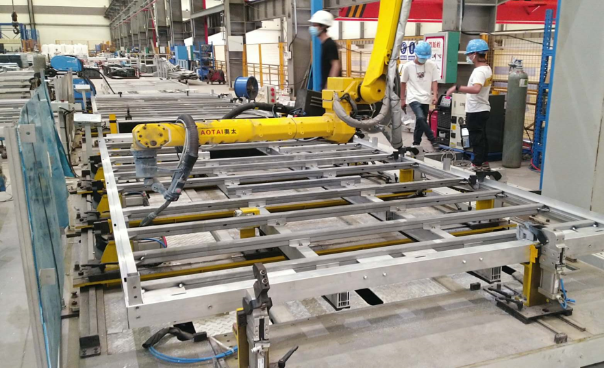 ? ? 除此之外,南南鋁通過設計通用的、可調節(jié)的車底架工裝夾具,同步電機驅動工裝夾具整體移動車底架,解決底邊框、副縱梁Y坐標變化無法焊接問題,實現(xiàn)大部分車型的車底架智能化、自動化、科技化的精密焊接。